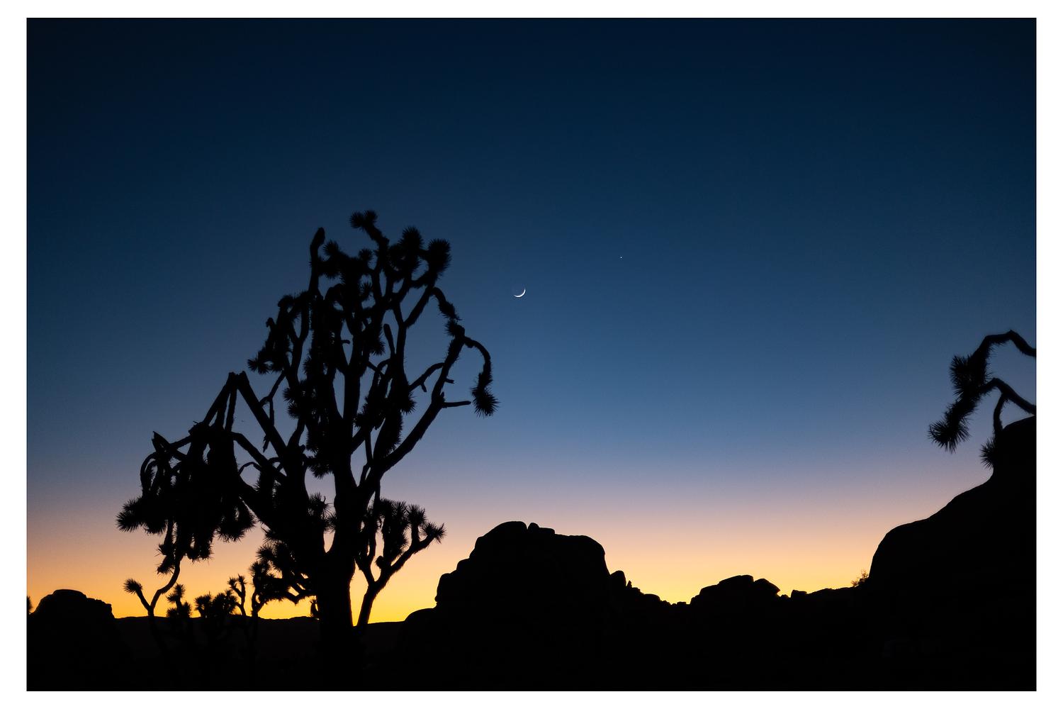A crescent moon and Mars rise over Joshua Tree's "Hidden Valley" during a fireburst sunset, March 2023.