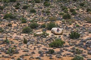 A lone climber traverses an out-of-place boulder in Joshua Tree National Park. March 2022.