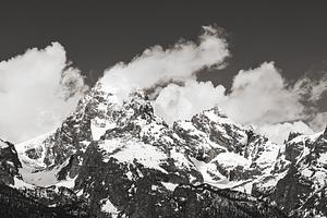 The summits of Grand Teton and Mount Owen, two of the most prominent peaks in the Teton Range, peaking through late-afternoon storm clouds. June 2022.