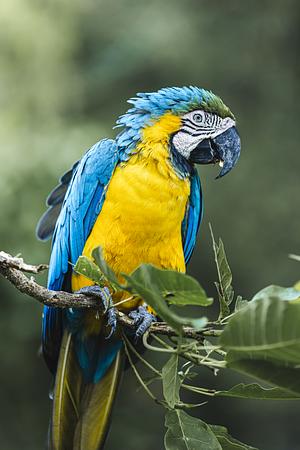 A blue and yellow Macaw dines in the state of Santander, Colombia. April 2023.