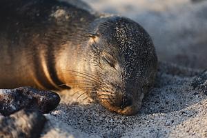 A juvenile sea lion rests at sunset. Isla San Cristobal, Galapagos Islands. June 2023