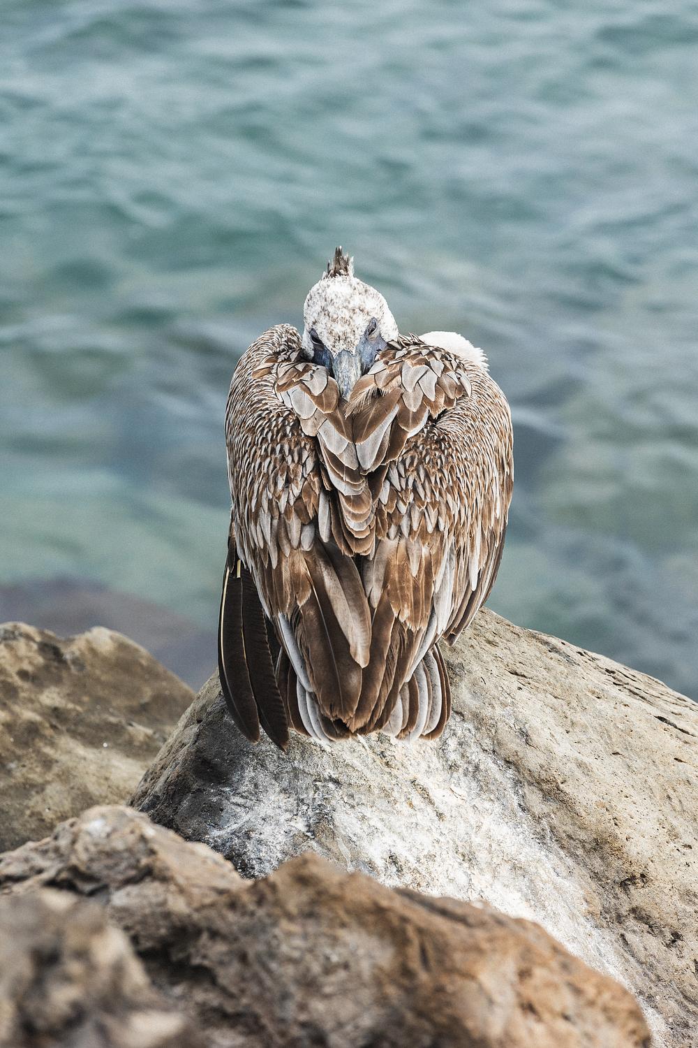 A pelican hides from the wind. Isla San Cristobal, June 2023.