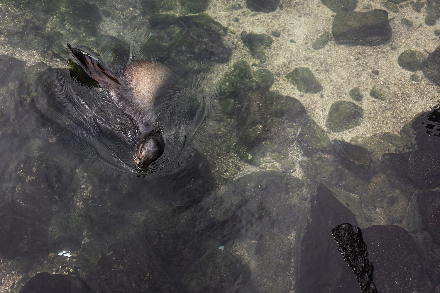 An adolescent sea lion goes for a morning dip on Isla San Cristobal. Galapagos Islands, June 2023.