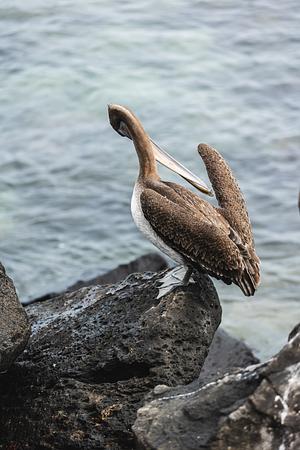 A pelican self-grooms on Isla San Cristobal. Galapagos Islands, June 2023.