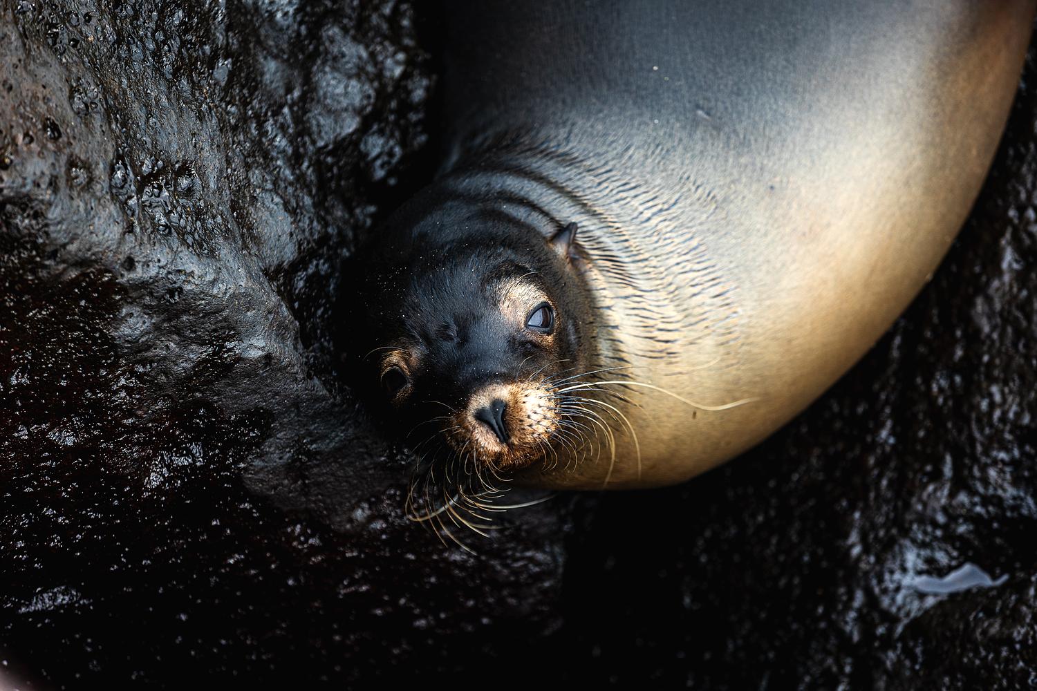 A juvenile sea lion awakes from a nap on Isla San Cristobal, June 2023.