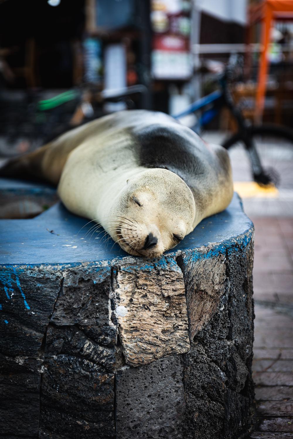 A sea lion naps on the sidewalk of Isla Santa Cruz. Galapagos Islands, June 2023.