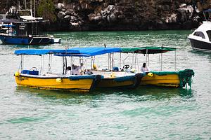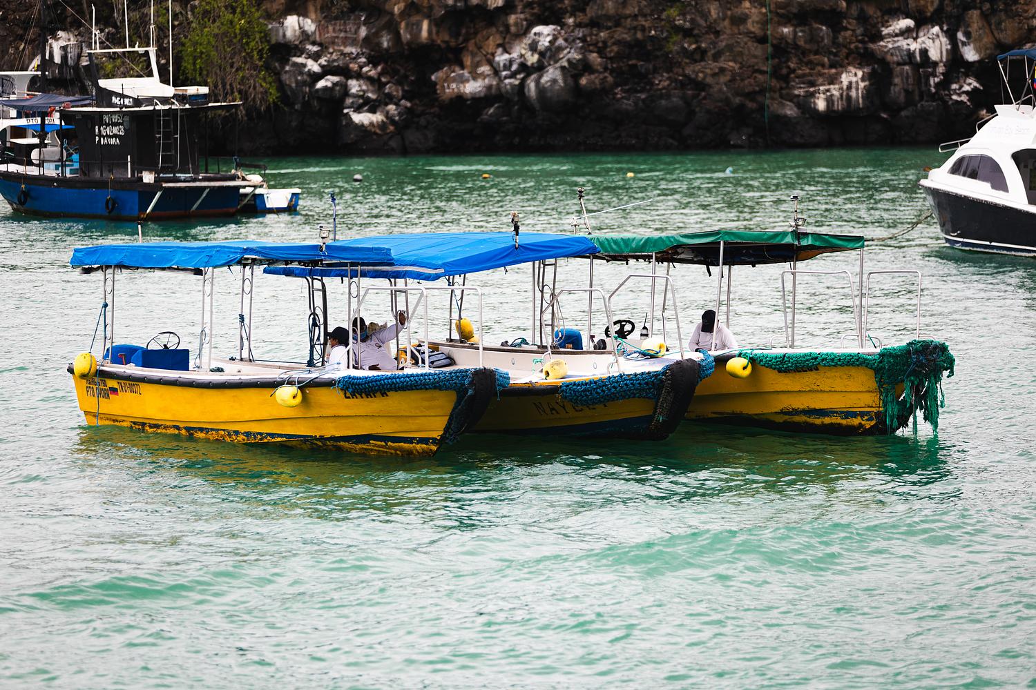 Galapagos Water Taxi's await to shuttle tourists and locals alike from ferry-to-dock. June 2023.