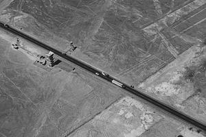 The Pan American Highway cuts across the frame featuring two viewing platforms of three Nazca geoglyphs: The Hands, The Tree, and The Lizard (cut by the Pan American Highway itself.)