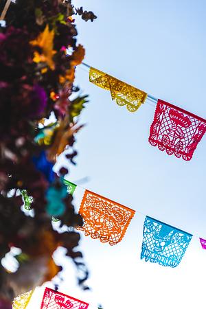 Colorful flags don the streets above San Miguel de Allende, Mexico during the 2022 celebration of Dia de Los Muertos. October 2022.