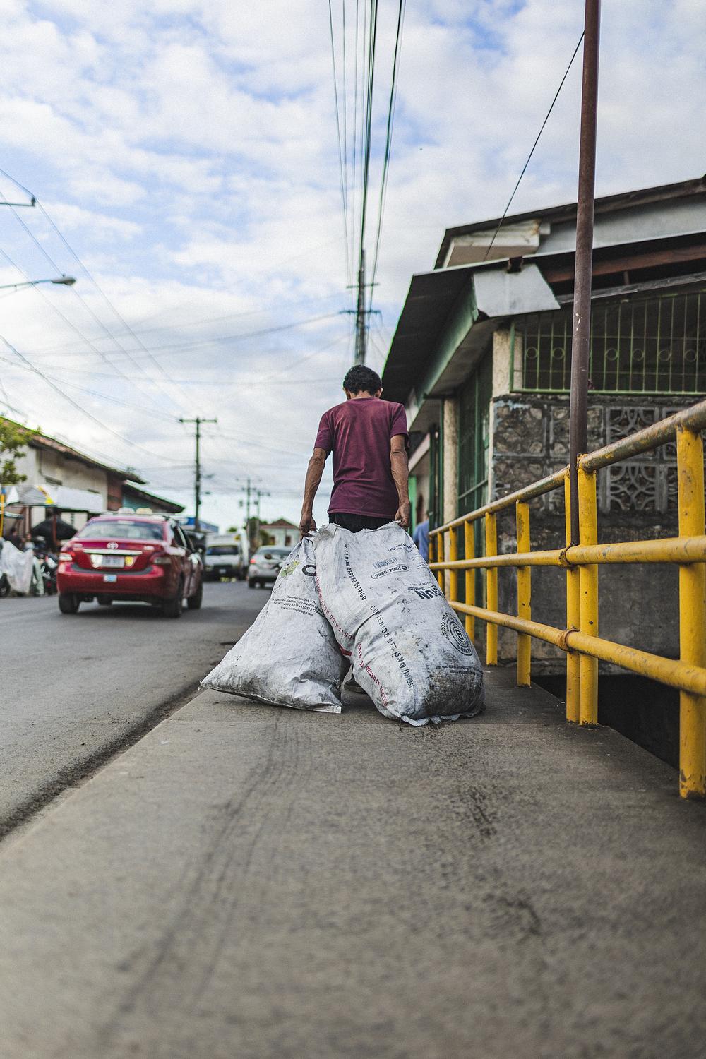 An unknown man drags bags of potatoes through the streets of Leon, Nicaragua. January 2023.