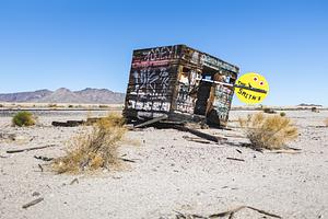 A dilapidated shack, with a pop of color, in the desert east of Joshua Tree National Park. January 2022.