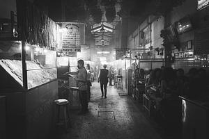 A black-and-white of one of Oaxaca, Mexcio's busiest markets. November 2022