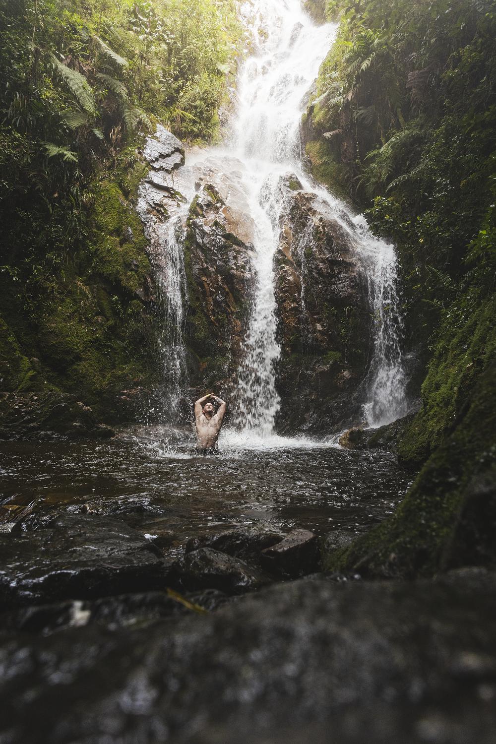 A swim in El Salto de Angel, a waterfall outside of Medellín, Colombia. The approach trail begins at "La Cathedral", Pablo Escobar's self-built "prison" in the hills overlooking Medellín.