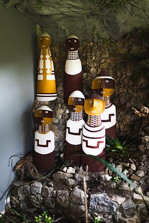 A group of Chachapoyas-style statues at the Museo de Leymeybamba, Peru. July 2023.