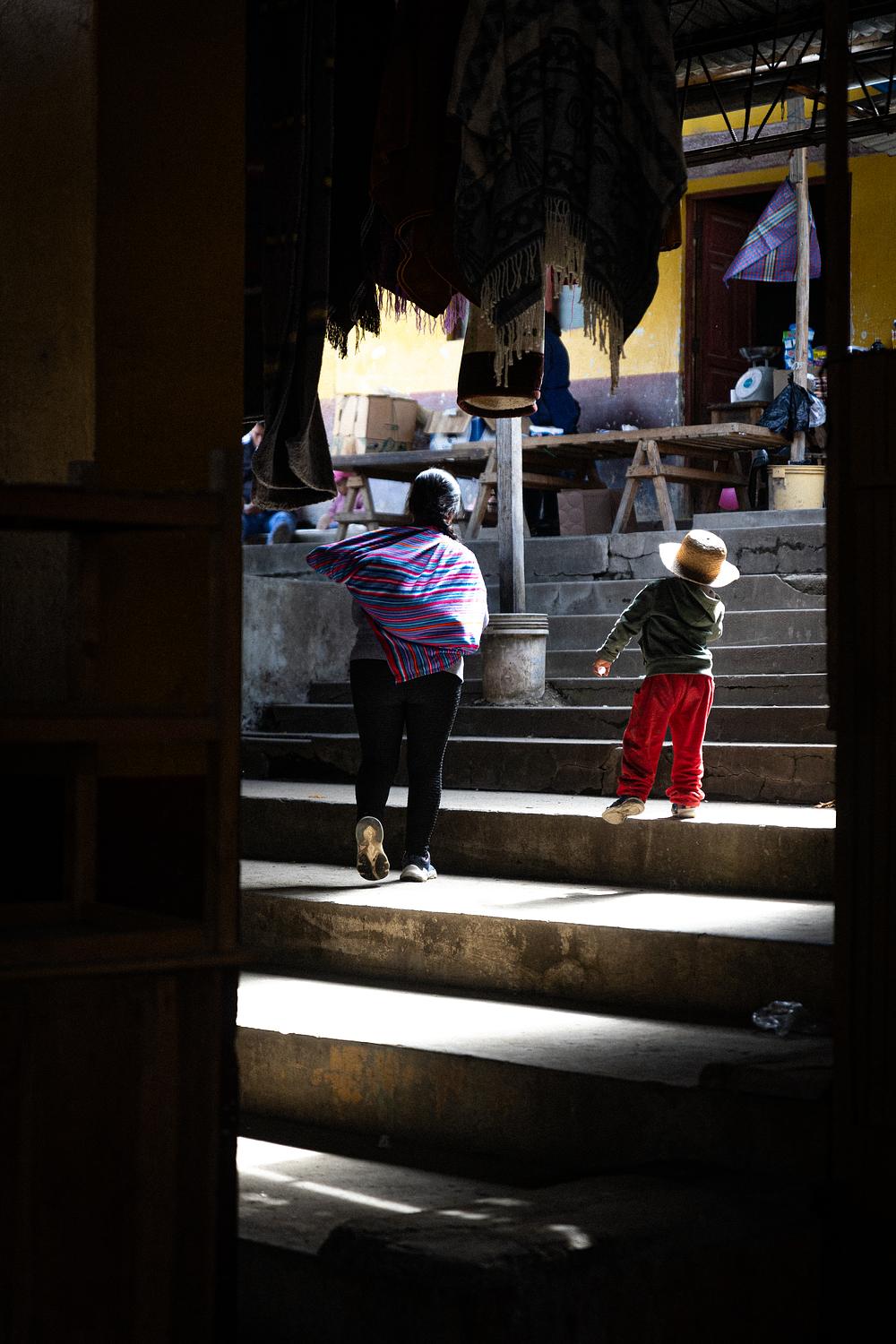 A mother and son out for a walk at the central market in EncaƱada, Peru. July 2023.